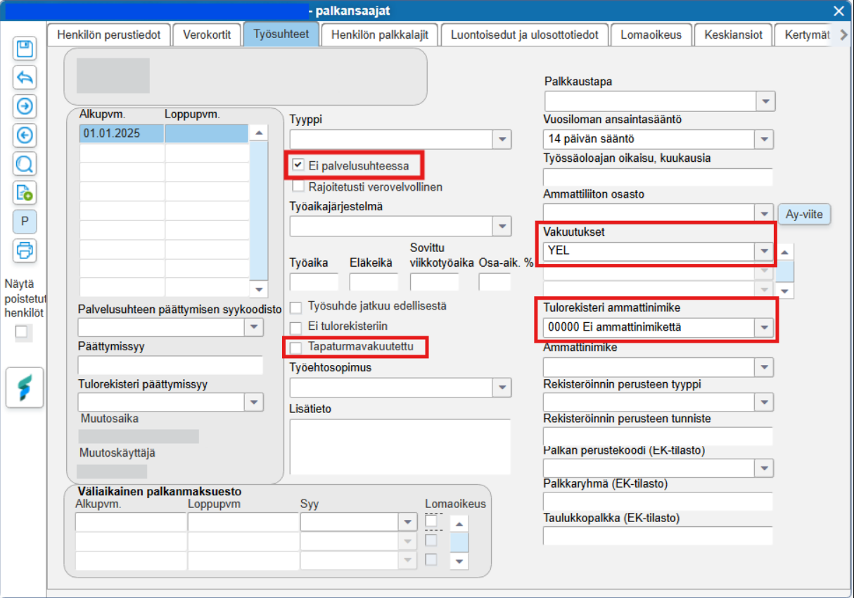 Palkansaajat-rekisterin Työsuhteet-välilehdelle tulee yrittäjän tietoihin valita Vakuutukset-kohtaan oikea YEL-vakuutus sekä tarvittaessa valita optio "Ei palvelusuhteessa", mikäli palvelusuhdetietoja ei yrittäjän osalta haluta nousevan Tulorekisteri-ilmoitukselle. "Tulorekisteri ammattinimike"-kenttään yrittäjille valitaan "00000 Ei ammattinimikettä", koska yrittäjät eivät ole lakisääteisen tapaturmavakuutuksen piirissä. Tällöin Työsuhteet-välilehdellä ei myöskään tule olla valittuna optiota "Tapaturmavakuutettu", eikä palkkalaskelmalla myöskään olla tapaturmavakuutuksen riviä. Näillä asetuksilla tulorekisteriin ilmoitetaan tarvittavat vakuuttamisen poikkeustilanteet, eli vakuuttamisvelvollisuutta ei ole työeläke- ja työtapaturma- ja ammattitautivakuutusten osalta. Valitse tarvittaessa "Ei palvelusuhteessa"-valinta aktiiviseksi, mikäli yrittäjä ei ole palvelussuhteessa. Fivaldi lähettää aina palvelussuhdetiedot palkkatietoilmoituksilla tulorekisteriin, vaikka kyseessä on vapaaehtoisesti annettava täydentävä lisätieto: