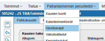 Varoitusrajat määritellään Palkanlaskennan perustiedoissa: valitse ylävalikosta Palkanlaskennan perustiedot > Varoitusrajat.