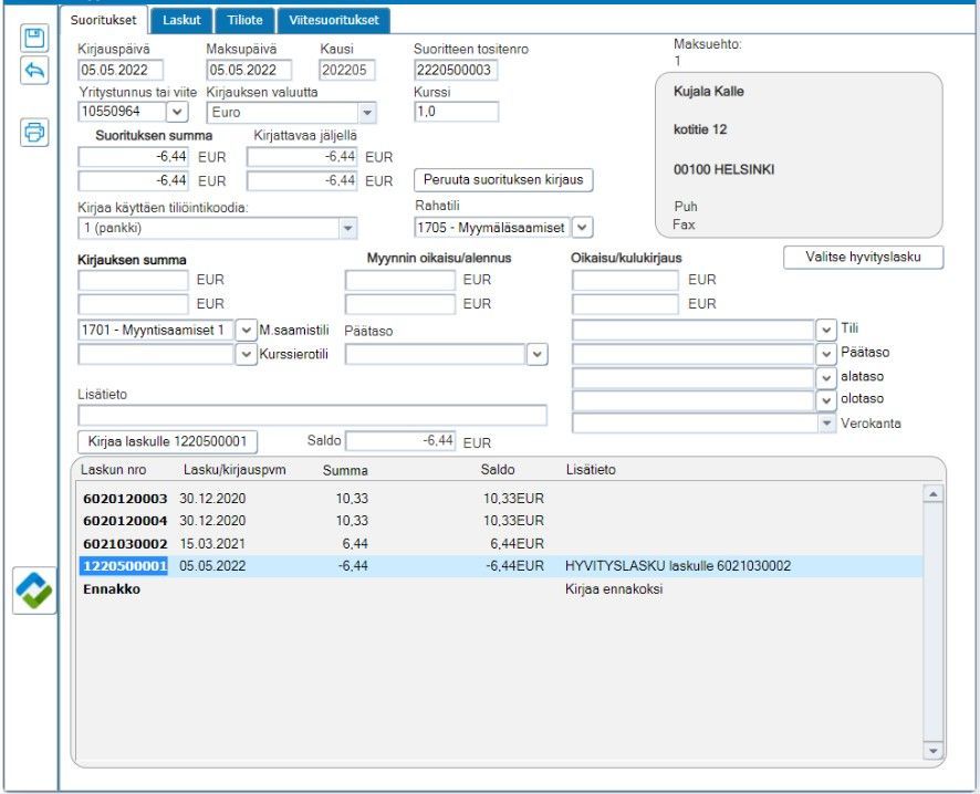 Myyntireskontraan kirjattu hyvityslasku näkyy Myyntireskontran Suoritukset-välilehdellä vastaavasti kuin yleislaskutuksen puolellakin luotu hyvityslasku. Hyvityslaskun ja veloituslaskun saa kuitattua päikseen valitsemalla ensin hyvityslasku (negatiivinen summa) ja napsauttamalla "Valitse hyvityslasku"-painiketta. Tämän jälkeen valitaan veloituslasku (positiivinen summa) ja napsautetaan "Hyvitä laskua"-painiketta.