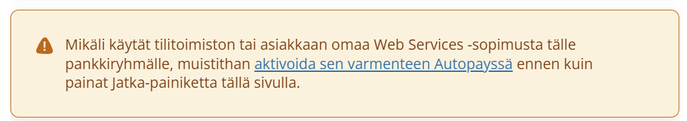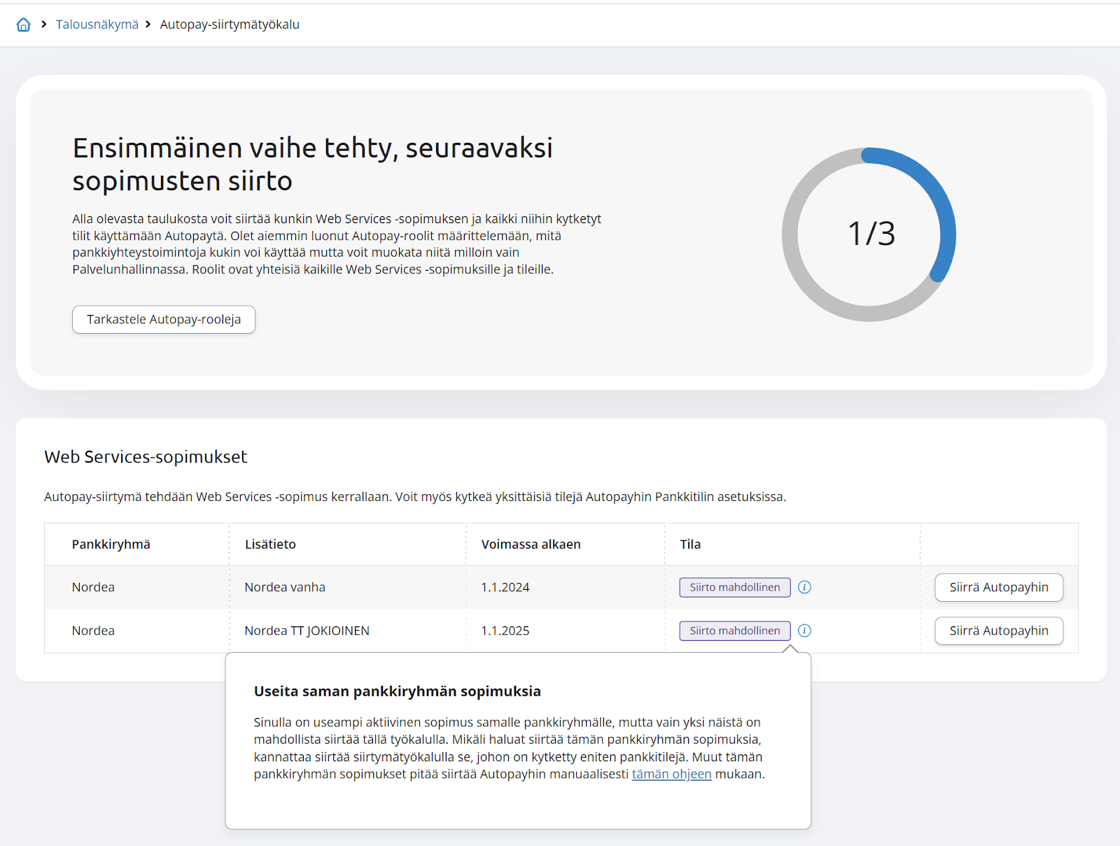 Autopay siirtymätyökalun varmenteidensiirto-osuudessa lisätty käyttäjälle tietoa, jos siirrettävissä sopimuksissa on enemmän kuin yksi saman pankkiryhmän sopimus. Siirtymätyökalu tukee vain yhden sopimuksen siirron Autopayhin.