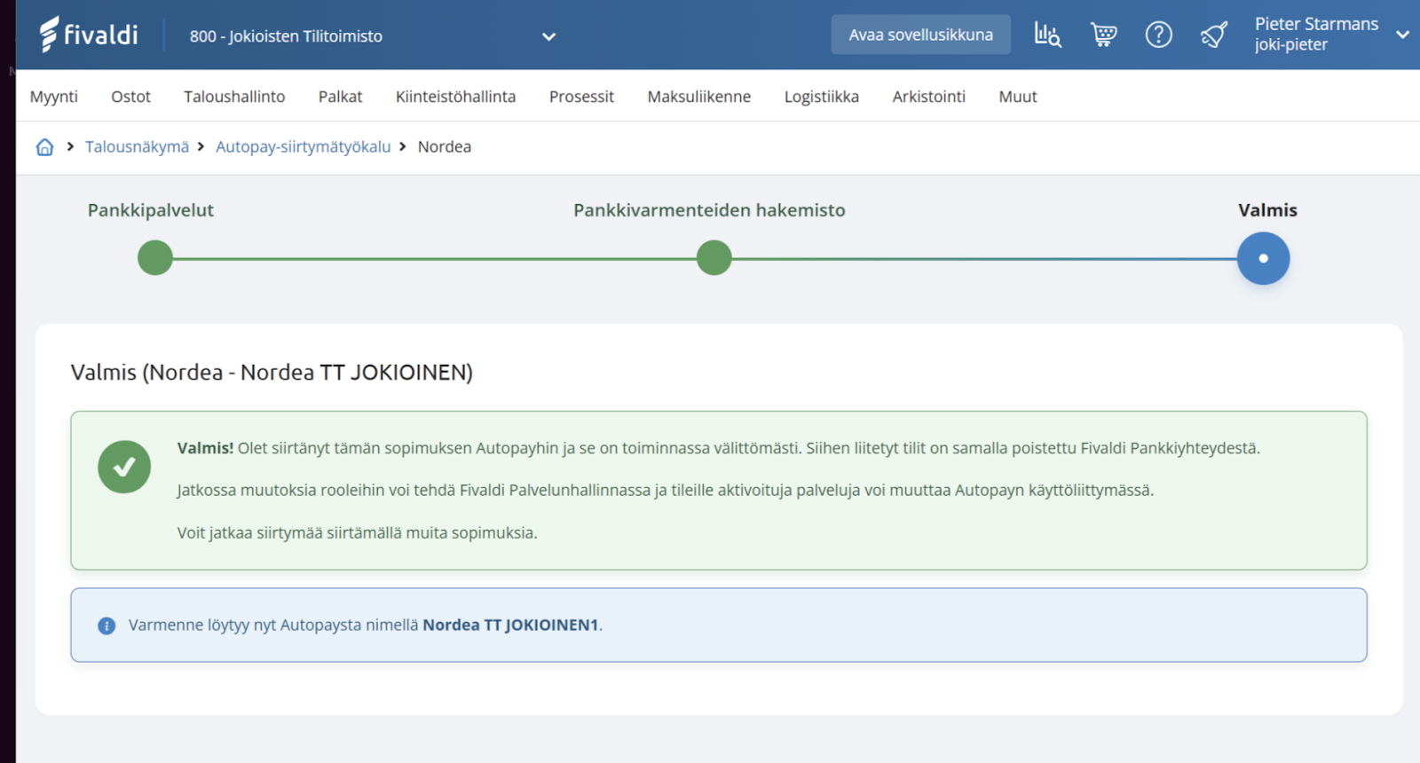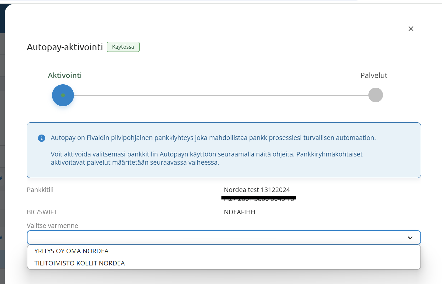 Yksittäisen pankkitilin aktivoimiseen Autopayhin tehty parannuksia Fivaldin Pankkitilit-asetuksiin.