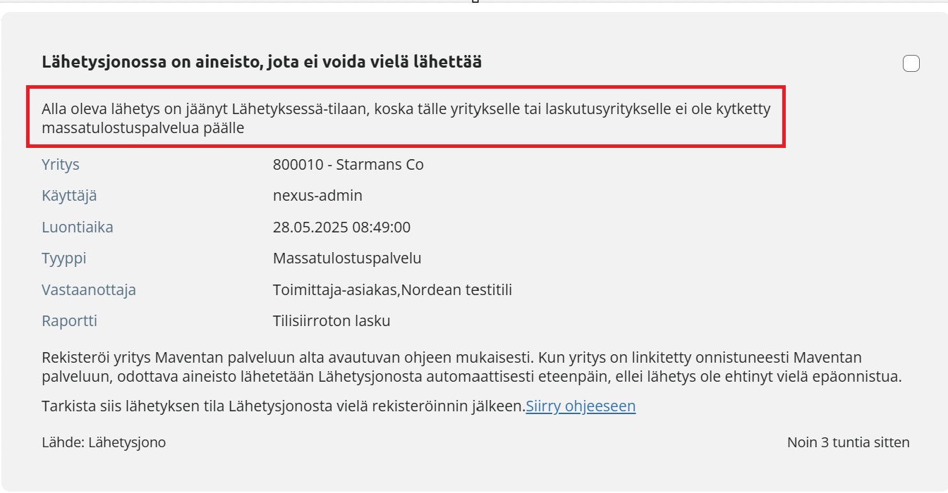 Jos tyyppinä on Massatulostuspalvelu, niin ilmoituksen tekstissä kerrotaan eri syy kuin Autoinvoice - tyypillä.