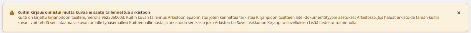 Korjaus: Parannettu virhekäsittelyä Kuittienhallinta-sovelluksessa. Jos kuitin kuvan arkistointi epäonnistuu kuitin kirjaamisen yhteydessä, niin käyttäjälle ilmoitetaan siitä sovelluksessa kirjauksen jälkeen. Tällaisessa tapauksessa kirjanpidon tosite muodostetaan, käyttäjän pitää tarkistaa arkistointiasetukset kuntoon ja hän voi ladata kuitin kuvan sovelluksesta myöhemmin ja tallentaa kuitin kuvan halutessaan arkistoon itse.