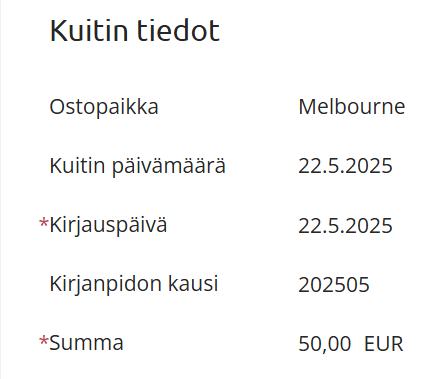 Korjaus: Korjattu Kuittienhallinta-sovelluksen kirjatun kuitin Kirjanpidon kausi -kentän sisältö.