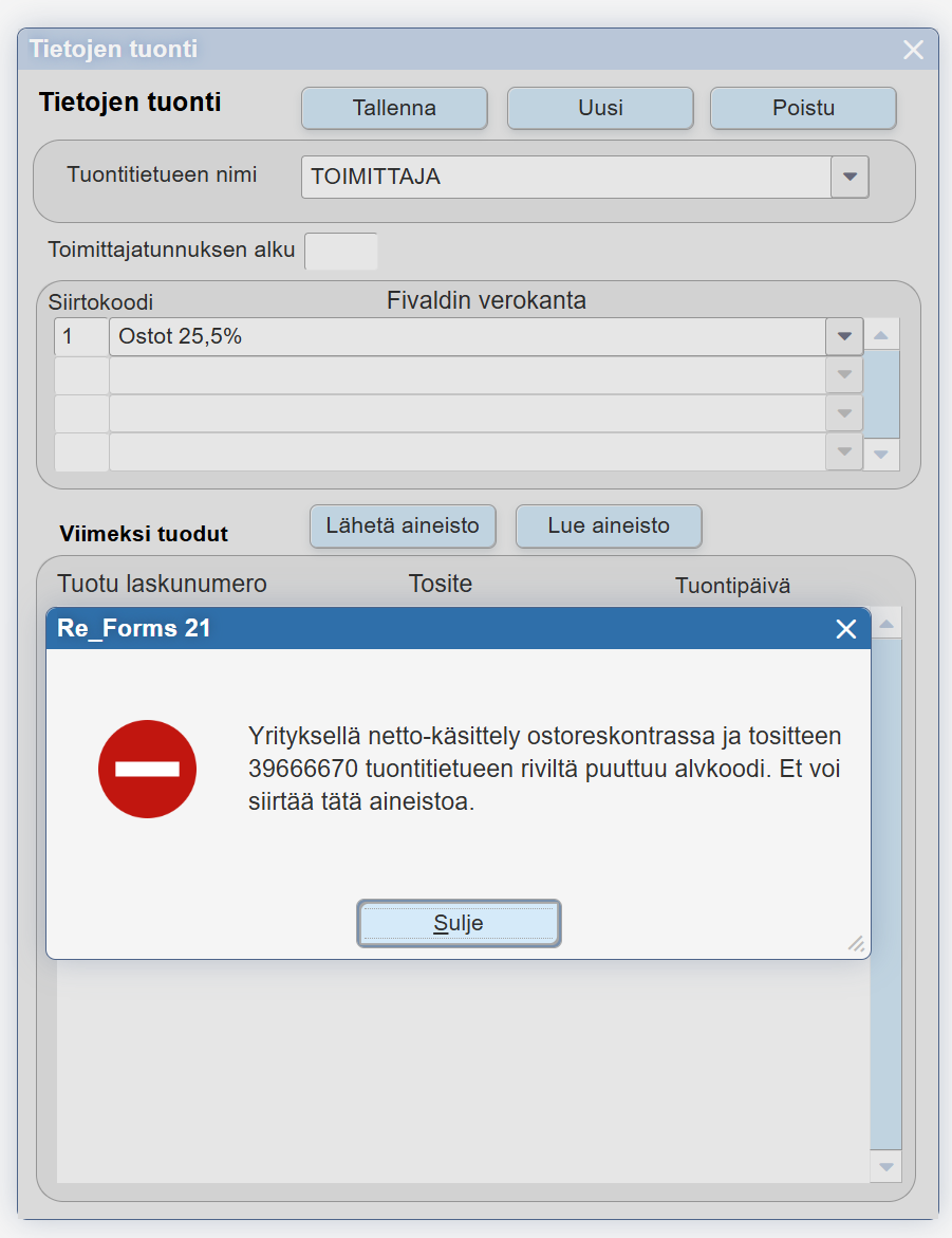 Korjaus: Estetty Ostoreskontran Tietojen tuonti -sovelluksessa tiedon tuonti, jos yrityksessä on Ostoreskontrassa nettokäsittely kirjanpidossa ja tuontitietueen OSRTAP-riviltä puuttuu alvkoodi. Tämä aiheuttaa ostoreskontrassa virhetilanteen, jos tiliöintirivi on ilman verokoodia.