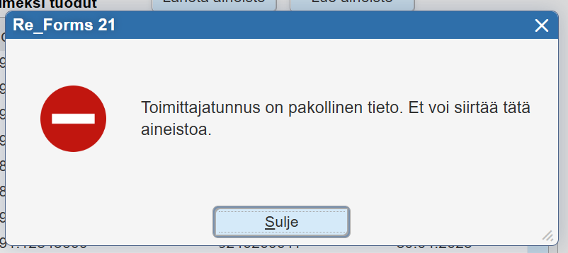 Samalla parannettu myös virheviestiä, jos aineistosta puuttuu pakollinen Toimittaja-tieto