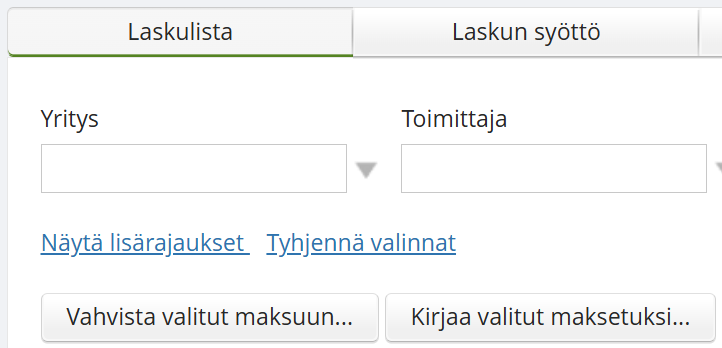 Korjaus: Parannettu logiikkaa Ostolaskujen kierrätyksen Laskulista-sivun "Vahvista valitut maksuun..." ja "Kirja valitut maksetuiksi..." - painikkeiden näkymiseen.