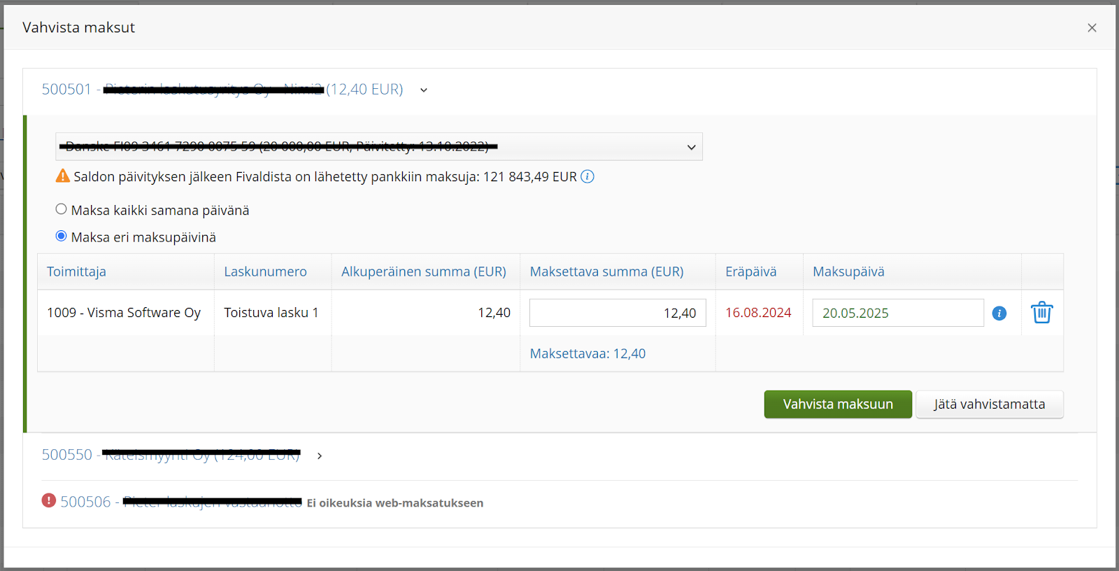 Näissä toiminnoissa on kuitenkin mahdollisuus valita useiden yrityksen maksuja kerralla ja avautuva ikkuna tarkistaa oikeudet kaikkiin yrityksiin erikseen, joten nappien näkymisen oikeustarkistus on otettu pois päältä.