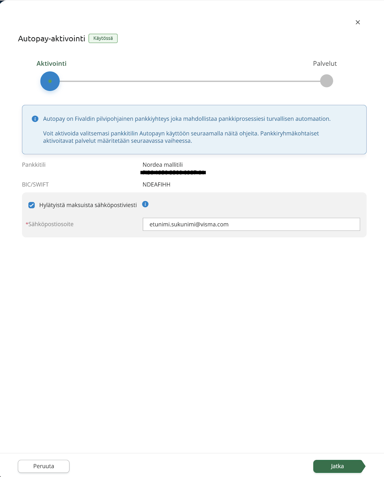 Käyttäjä voi myös määrittää sähköpostiosoitteeksi jonkun muun osoitteen kuin omansa. Fivaldi ehdottaa oletuksena tähän käyttäjän sähköpostiosoitetta. Tämä tieto tallentuu Autopayssä Yhteydenottosähköposti- kenttään.