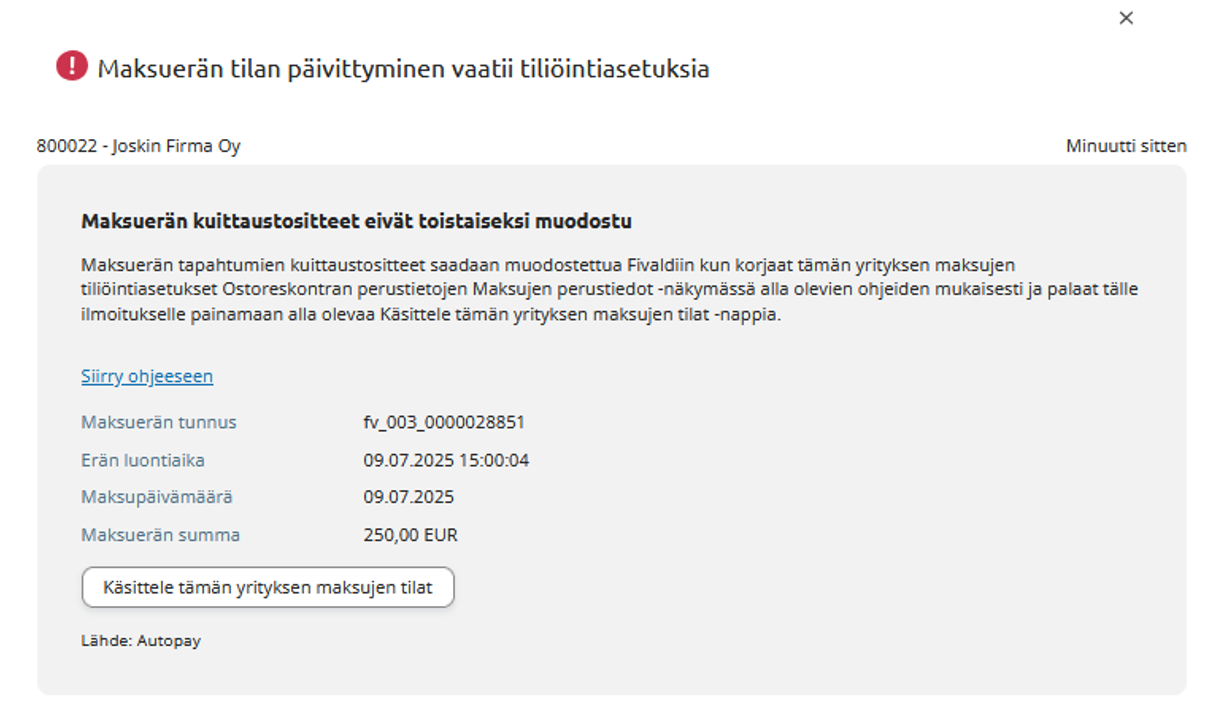 Käyttäjälle lähetetään selkeä ilmoitus, jos Autopayssa maksetuksi merkittyä maksua ei voida käsitellä loppuun