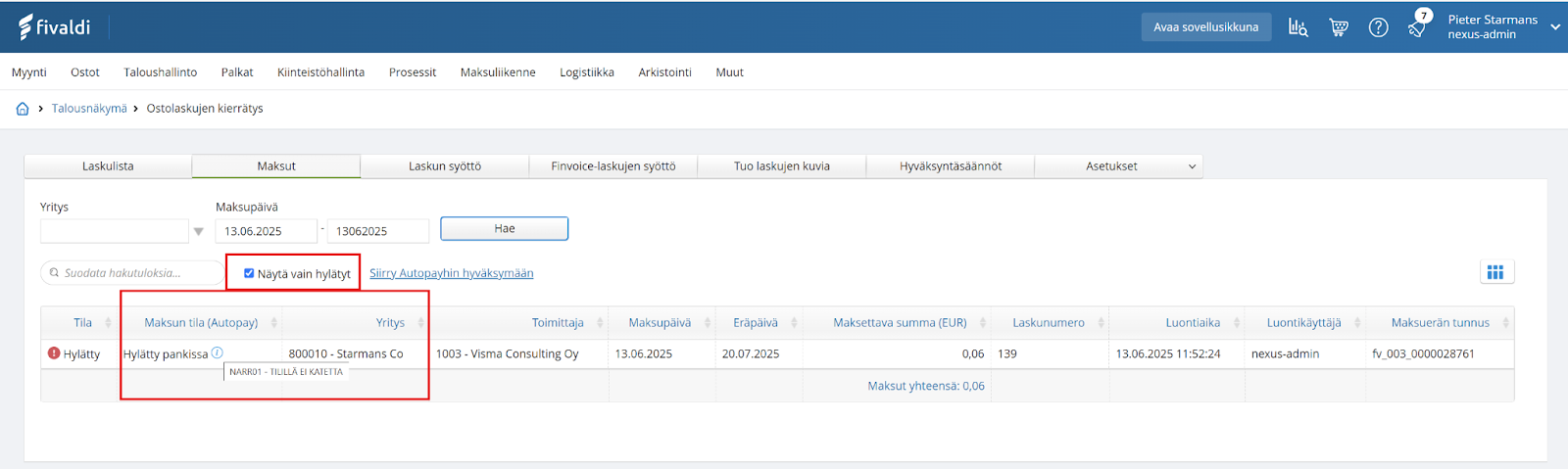 Ostolaskujen kierrätyksen Maksut-listaan on lisätty mahdollisuus rajata näkyvät maksut ainoastaan hylättyihin maksuihin. Autopayn maksuissa hylätyn maksutilan vieressä on info-kuvake. Liikuttamalla osoitin kuvakkeen päälle, käyttäjälle näytetään pankin antama maksun hylkääntymisen syy.