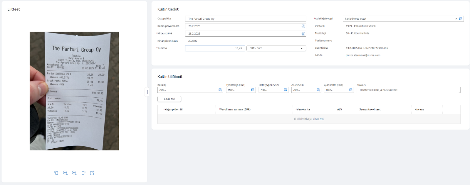 Kuitin kuvasta analysoidaan ja esitäytetään seuraavat arvot: