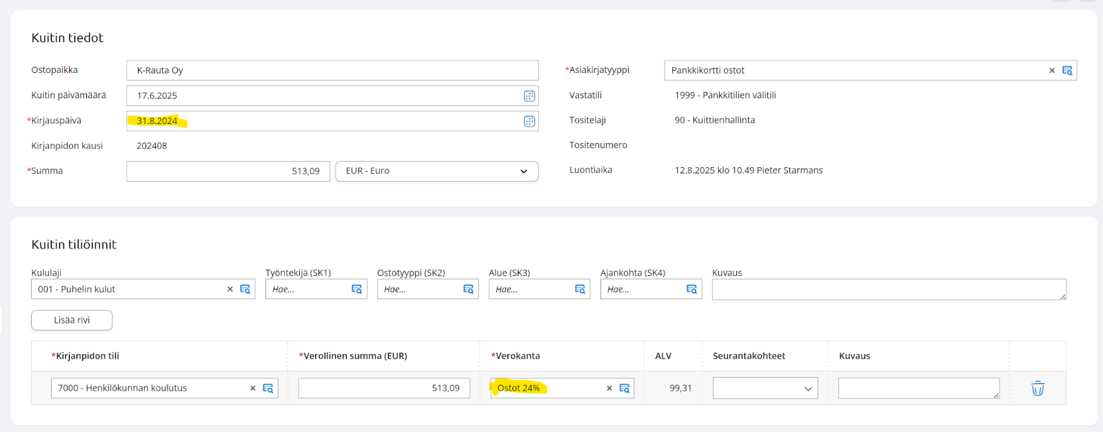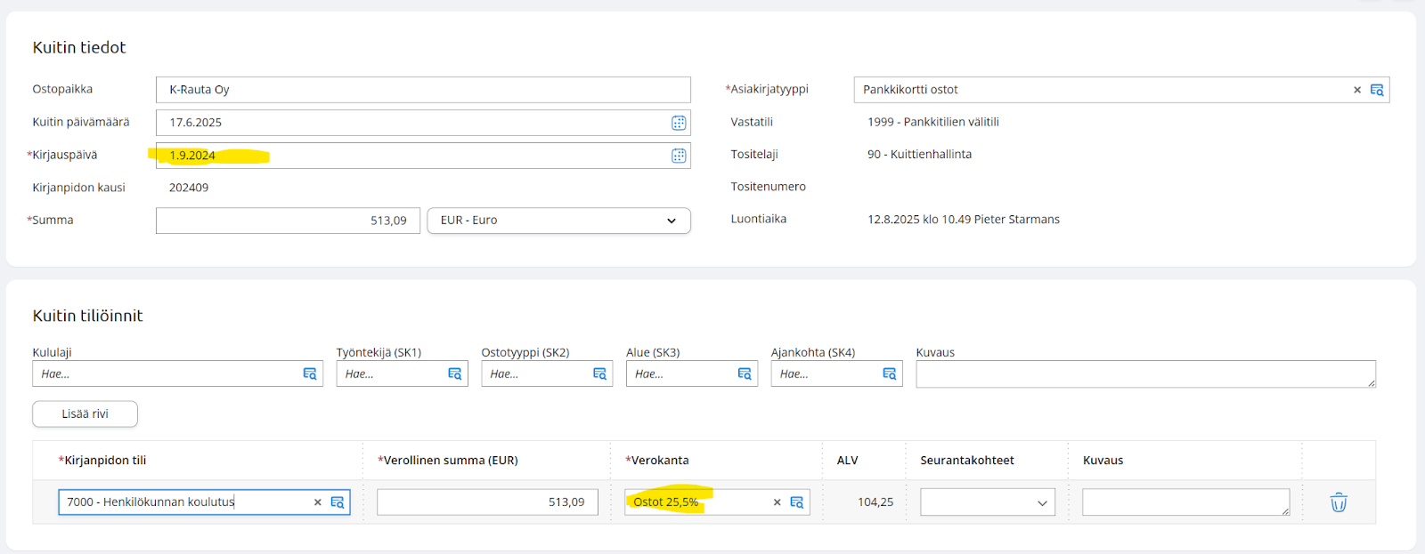 Parannettu verokannan asettamisen logiikkaa Kuittienhallinnassa kun uudelle tiliöintiriville valitaan kirjanpidon tili.