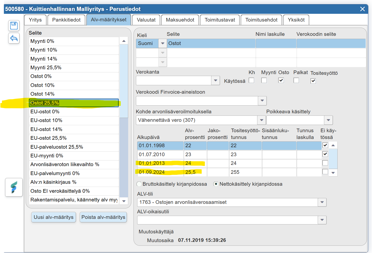 Esimerkki 31.8.2024 kirjauspäivänä tilin perusteella ehdotettu verokanta on 24% ja 1.9.2025 kirjauspäivänä verokannaksi ehdotetaan 25,5%.
