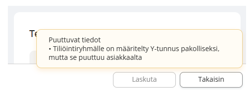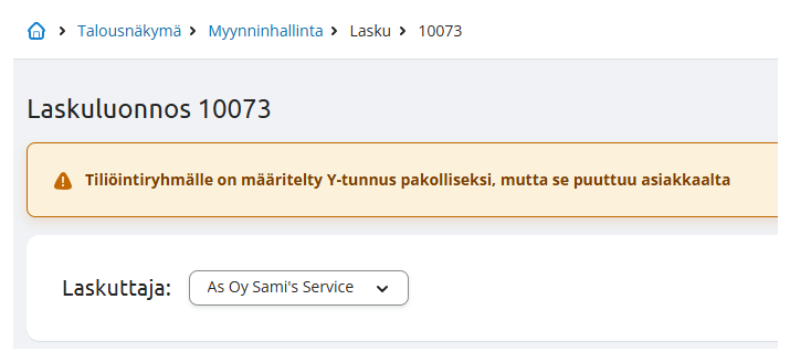 Mikäli yritykseksi määritellyltä asiakkaalta puuttuu Y-tunnus, niin Myynninhallinta herjaa seuraavasti: