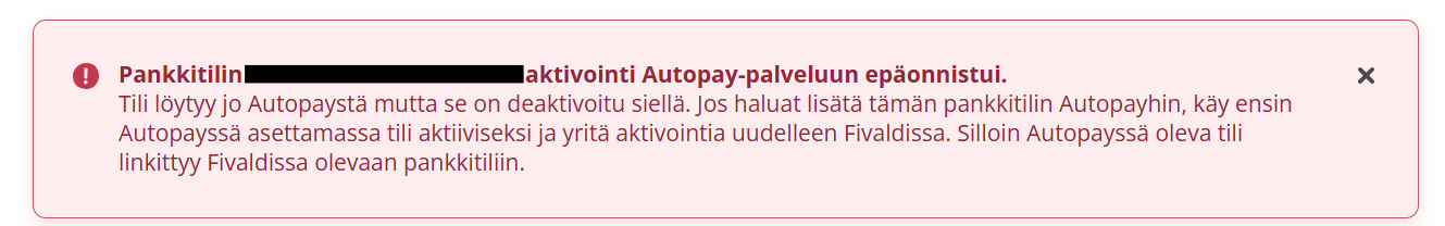 Korjaus: Parannettu virheilmoitusta pankkitilin aktivoimisessa Autopayhin silloin kun tili on jo Autopayssä yrityksellä, mutta se ei ole aktiivinen.