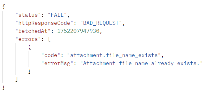 Korjaus: Estetty rajapinnan kautta tuotaessa samannimisten liitetiedostojen tallennus Myynninhallinnan tilaukselle. Eli jos myyntitilauksella on jo samanniminen liitetiedosto, ohjelma palauttaa http-koodin 400 ja virheen: