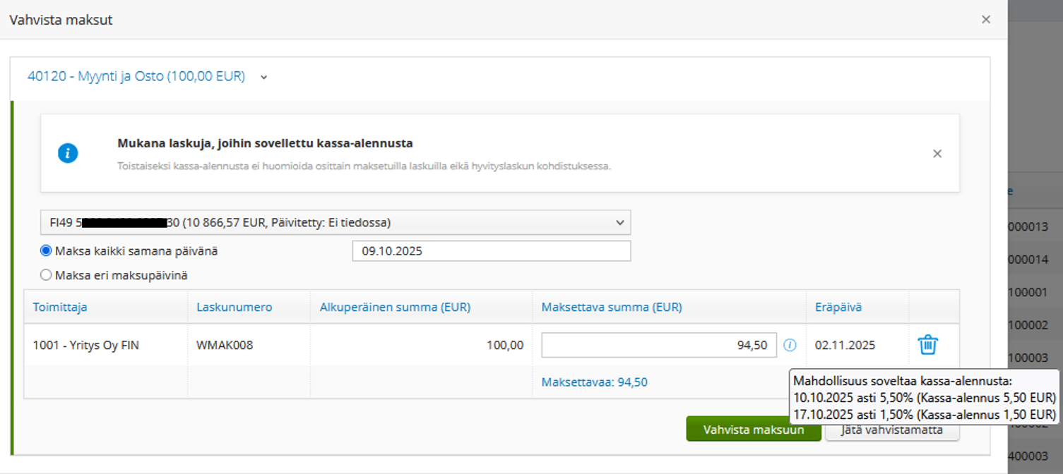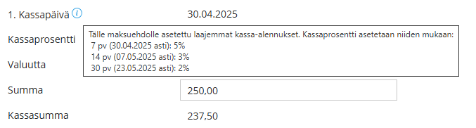 Jos lasku on jo osittain maksettu, kassa-alennusta ei huomioida.