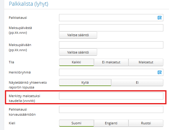 Lisätty tulostusrajaus "Merkitty maksetuksi kaudella (vvvvkk)" Palkkalista-raporttiin.