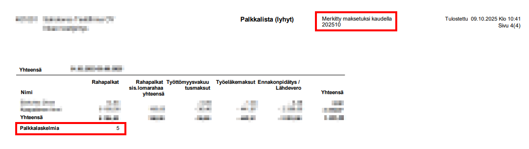 Lisätty viimeiselle sivulle Yhteensä sarakkeistoon rajausten mukaiset palkkalaskelmien lukumäärät yhteensä: