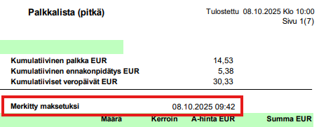 Palkkalista (pitkä) raportissa näkyy maksetuksi merkinnän tarkka ajankohta.