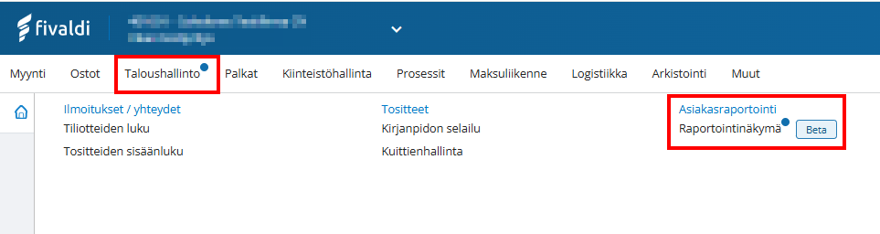 Uusi Raportointinäkymä Taloushallinto-valikkoon.