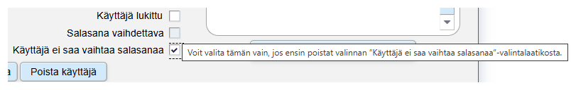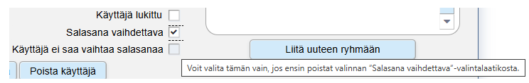 Nyt on tehty tarkistus, että <Salasana vaihdettava> ja <Käyttäjä ei saa vaihtaa salasanaa> -valinnat eivät ole yhtä aikaa valittuina.