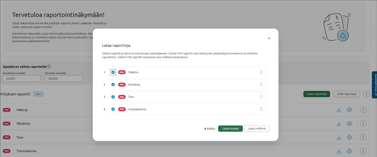 Raporttien järjestystä PDF-yhdistelyssä voi halutessaan myös muuttaa.