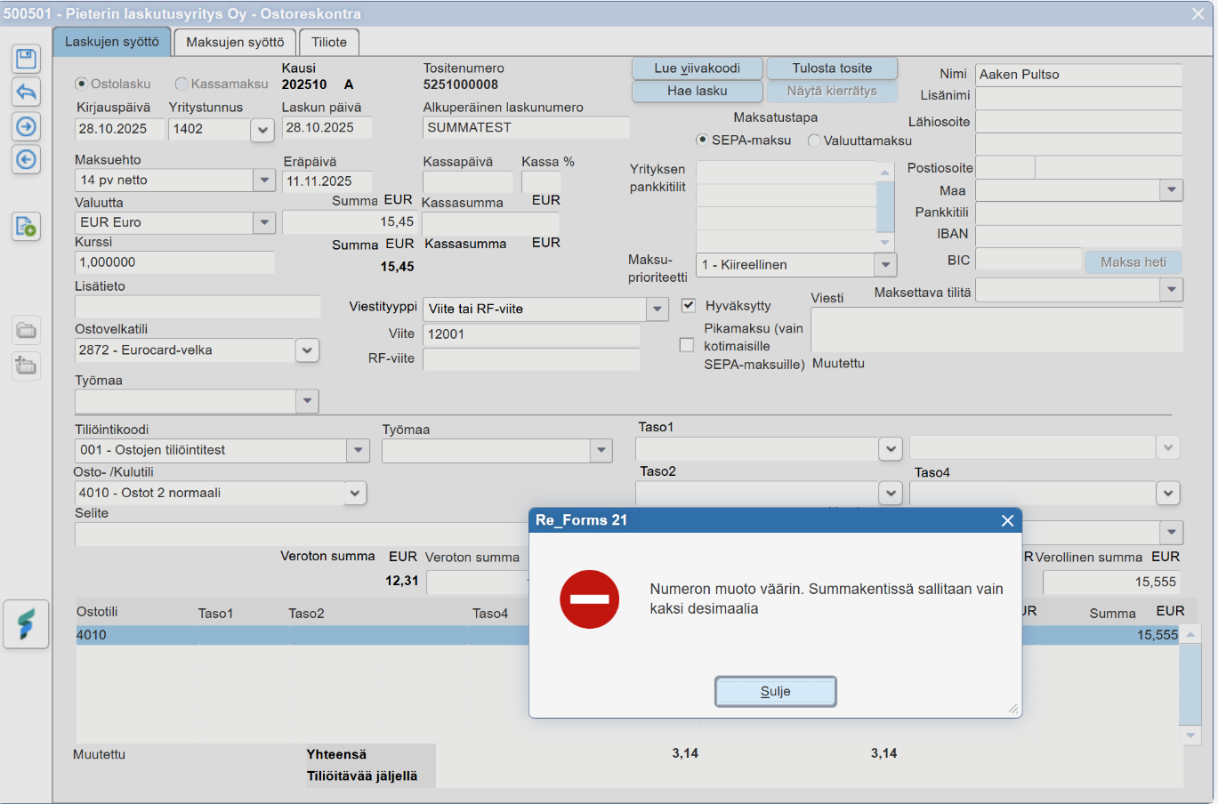 Kuvaavampi virheilmoitus, jos ostoreskontran tiliöinnin summakentään syötetään kolme desimaalia