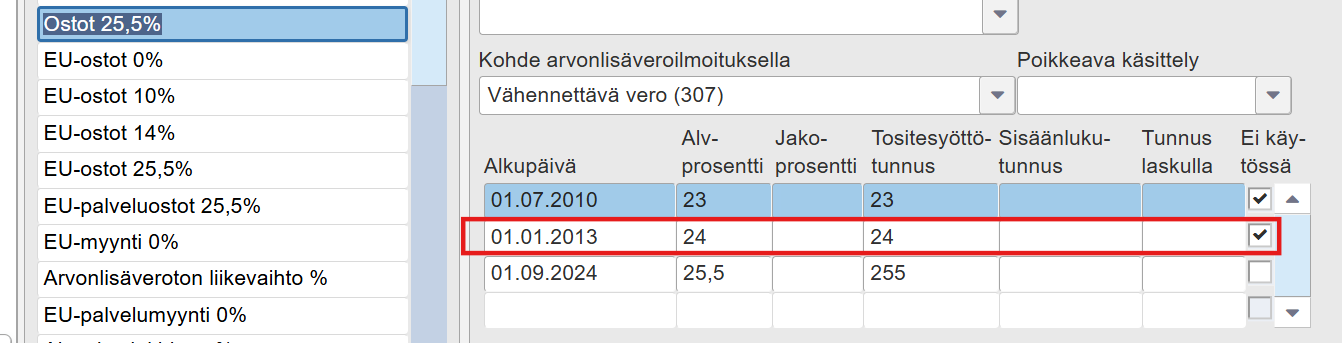 Tällainen tilanne voi tulla vastaan esimerkiksi selaillessa vanhoja laskuja, joiden verokanta ei ole tällä hetkellä käytössä (esim. jos Ostojen vanhan 24%-rivin kohdalle on valittu ALV-määrityksissä “Ei käytössä” -ruksi)