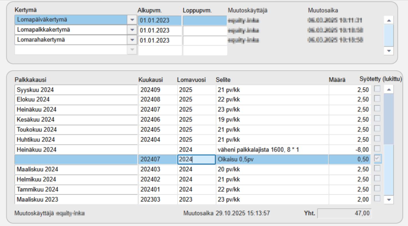 Ohjelman muodostamiin riveihin tehdyt manuaaliset korjaukset aiheuttivat virheellisiä laskentoja henkilön kertymiin, minkä vuoksi niiden muokkaaminen on jatkossa estetty. Mikäli löydätte palkansaajilta rivejä, joissa on ohjelman muodostamalla rivillä Syötetty-valinta päällä ja kertymien laskennassa virheitä, olethan yhteydessä sovellustukeemme, niin korjaamme tiedon puolestanne.