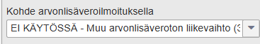 Kyseisen määrityksen (310) käyttö muun arvonlisäverottoman liikevaihdon ilmoittamiseen on päättynyt ja nykyään ko. kenttää käytetään EU:n ulkopuolelta maahantuotujen tavaroiden ilmoittamiseen, jolle on oma valinta valittavissa tässä pudotusvalikossa sekä oma alv-määrittely. Selkeyden vuoksi tämän kentän selitettä muutettiin, jotta sitä ei vahingossa enää valittaisi listalta.