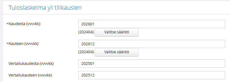 Valitun ajanjakson loppukaudesta seuraava maksukausi -tulostussääntö hakee raportille päänäkymän rajauksen loppukaudesta (esim. rajaus 202512-202512) edeltävän kohdekauden (marraskuu) arvonlisäveron tiedot (maksukausi 202601).