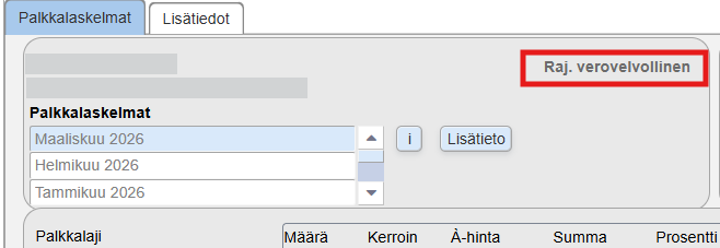 Palkanlaskennan pääruudulla ei näy enää suorituslajitietoa. Jatkossa näkyy vain tieto "Raj. verovelvollinen", mikäli kyseinen valinta on valittuna henkilölle: