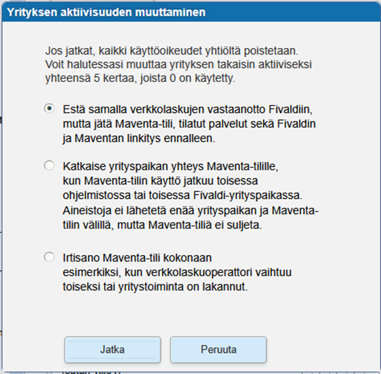 Ensimmäinen valinta estää verkkolaskujen vastaanoton Maventa-tililtä kyseiseen Fivaldi-yrityspaikkaan. Jos kyseinen Fivaldi-yrityspaikka myöhemmin aktivoidaan uudelleen, verkkolaskujen vastaanotto on kytkettävä uudelleen päälle Fivaldin verkkolaskupalvelusta.