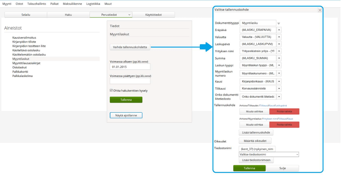 - Määritetään oikeudet aineisto-kohtaisesti. Tarvitaan esim. myyntilaskujen kohdalla oikeudet, jotta muukin kuin liitteen lisääjä näkee arkistossa laskun liitteen.