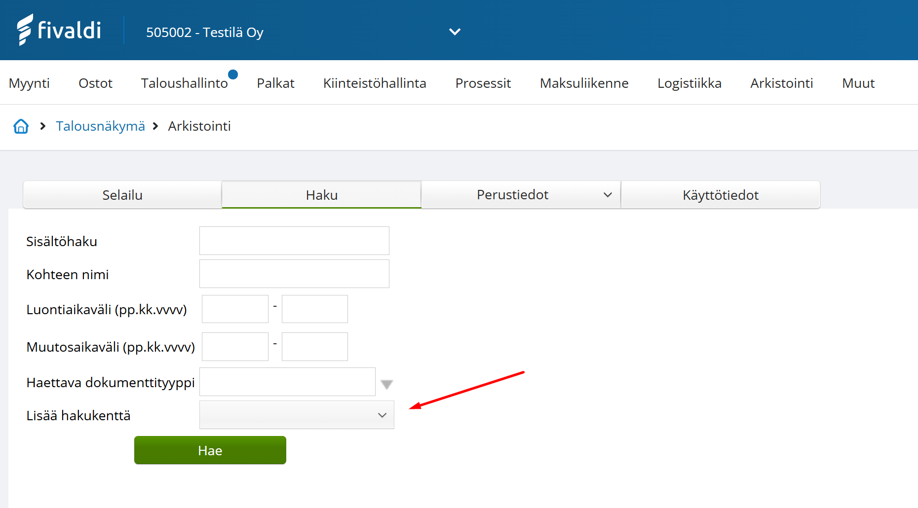 Hakua voidaan rajata tiettyyn aineistoon, esim. myyntilaskuihin. Kun valitaan tietty dokumenttityyppi, voidaan hakea tuon dokumenttityypin hakukentillä haluttua aineistoa.