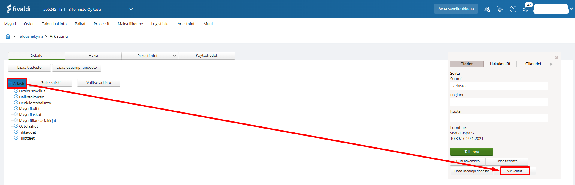- Avaa Arkisto Fivaldin ylävalikosta: Arkistointi > Arkistointi.
