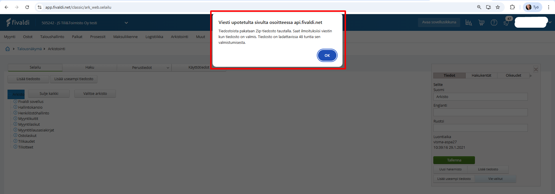 - Ohjelma antaa sinulle ilmoituksen, että ainestosta pakataan taustalla ZIP-tiedosto ja sen valmistuttua sinulla on 48 tuntia aikaa ladata tiedosto omalle koneellesi. Kuittaa ilmoitus napsauttamalla OK-painiketta: