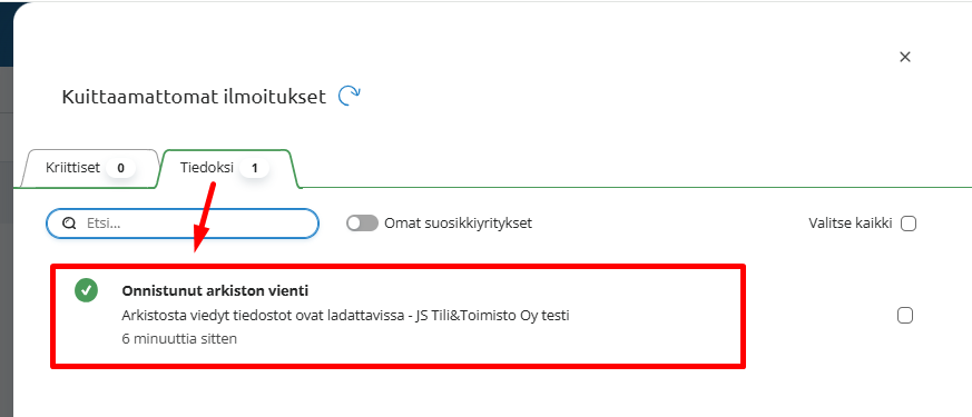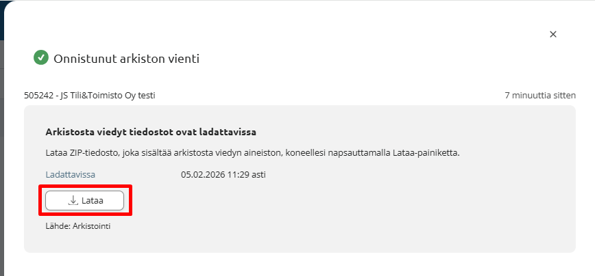 Jos arkistovienti epäonnistuu kokorajoituksen vuoksi, tulee tiedot ladata Arkistosta pienemmissä osissa, esim. tilikausi kerrallaan (tai jopa tätä pienemmissä osissa).
