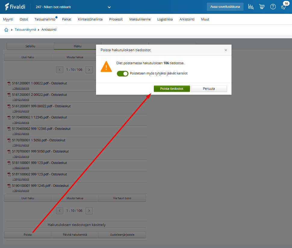 Arkistotietojen poistaminen haun kautta