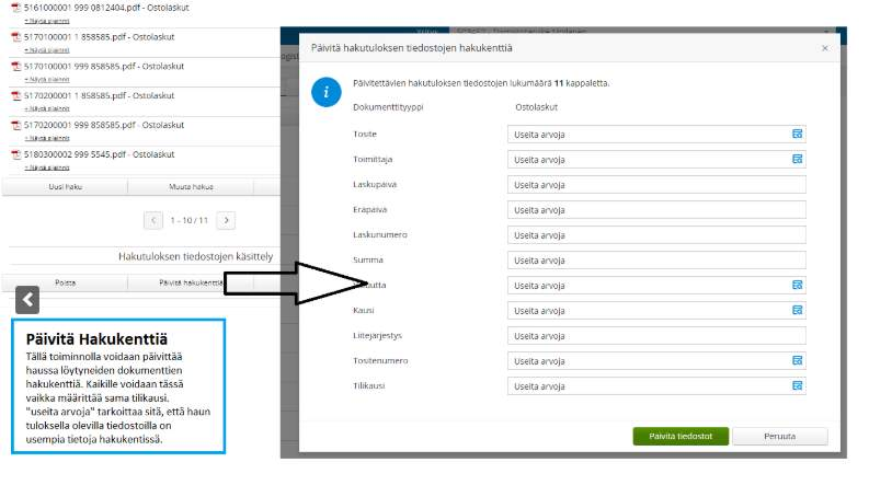 Arkiston Haku-osiossa voit päivittää haussa löytyneiden dokumenttien hakukenttiä. Aloita hakukenttien päivitys napsauttamalla Hakutuloksen tiedostojen käsittely -osiosta löytyvää Päivitä hakukenttiä -painiketta. Näin voit määrittää kaikille tiedostoille kerralla esim. saman tilikauden.
