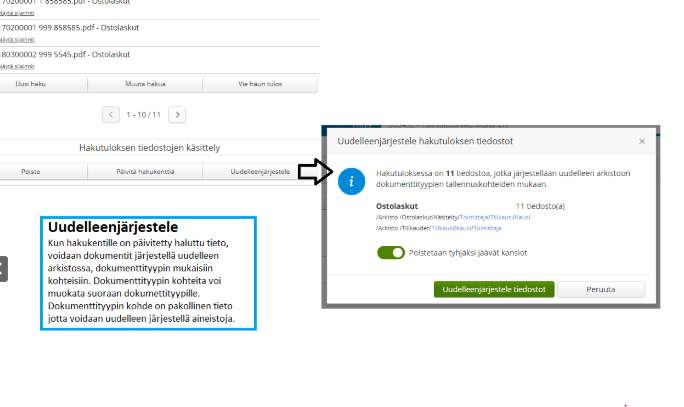 Arkiston Haku-osiossa voit uudelleenjärjestellä haussa löytyneitä dokumentteja. Aloita uudelleenjärjestely napsauttamalla Hakutuloksen tiedostojen käsittely -osiosta löytyvää Uudelleenjärjestele-painiketta.