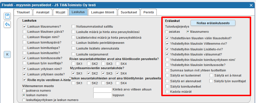 - Tulostusjärjestys = Laskujen tulostusjärjestyksen voi valita asiakasnumeron tai tilausnumeron mukaiseen järjestykseen.