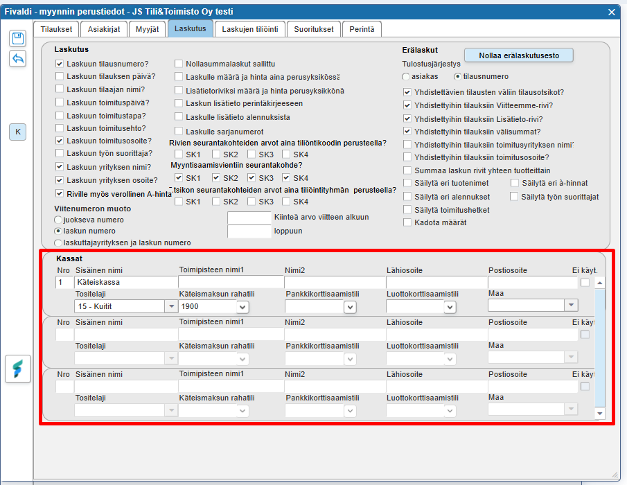 Jos tilauksista tehdään käteiskuitteja. on perustettava ainakin yksi kassapiste. Maksutapana voi olla käteisen lisäksi myös luotto- ja pankkikortti. Jos kassapisteiden omia yhteystietoja ei ole perustettu, ohjelma käyttää oletuksena yrityksen perustietojen yhteystietoja.