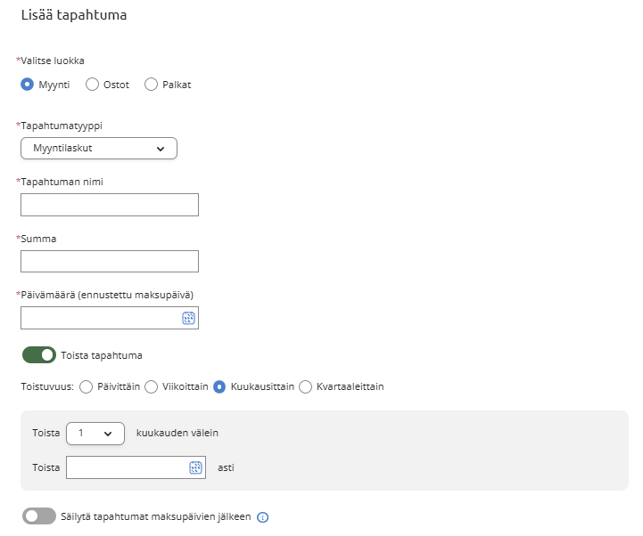 | Huomioi omat tapahtumat | Otetaanko omat tapahtumat huomioon kassavirtaennusteessa? |