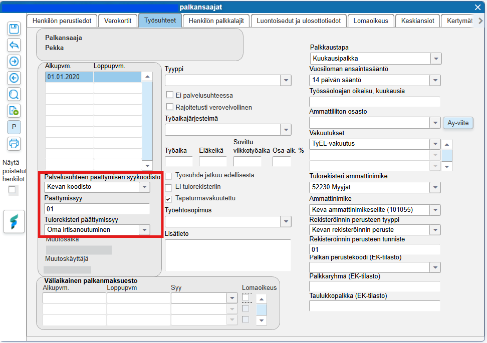 - Palvelussuhteen päättymisen syykoodi