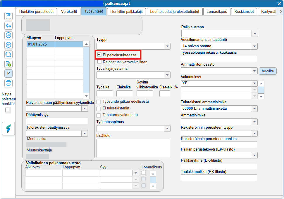 Jos tulonsaaja ei ole palvelussuhteessa tulonmaksajaan, valitse Ei palvelusuhteessa -valintaruutu. Tällöin työsuhteen alkupäivää ei ilmoiteta. Palvelussuhteessa-tiedolla on merkitystä esimerkiksi sosiaalivakuutusmaksujen määräytymiseen ja siihen, onko tulonsaajalla oikeutta hakemaansa etuuteen. Palvelussuhteessa oleminen vaikuttaa lähes kaikkiin etuuksiin. Oletuksena ohjelma ilmoittaa henkilön olevan palvelussuhteessa.