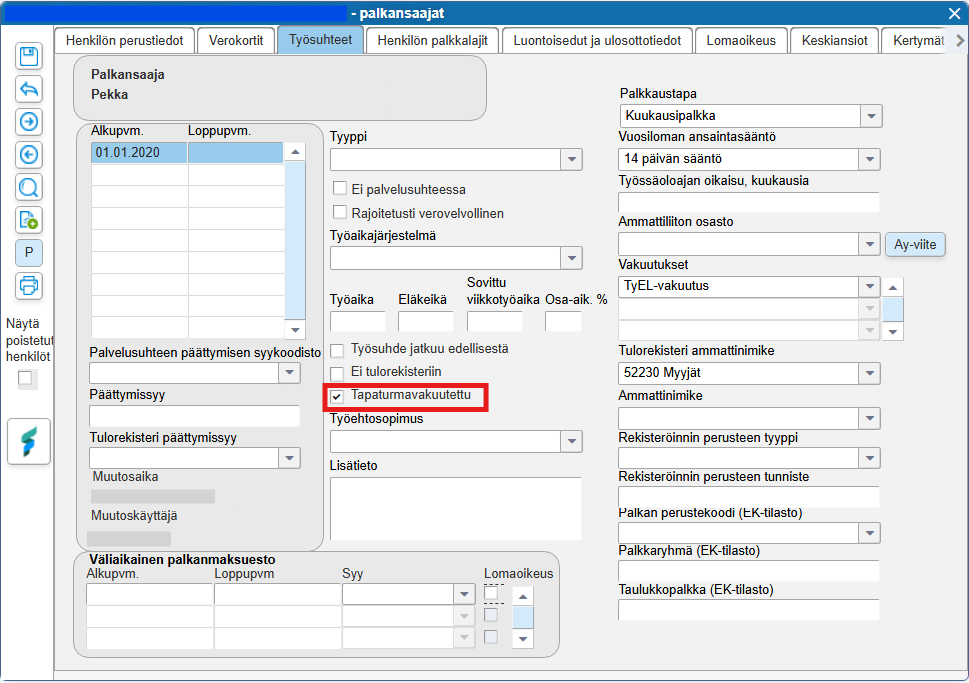 Uudelle työsuhteelle asetetaan automaattisesti valinta Tapaturmavakuutettu. Valinnalla estetään tapaturmavakuuttamisen poikkeuksen muodostuminen palkkatietoilmoitukselle, vaikka palkkalaskelmalla ei olisi tapaturmavakuutuspalkkalajia. Jos haluat ilmoittaa tulonsaajakohtaisen poikkeuksen (esim. yrittäjiltä), poista valinta tästä ruudusta.
