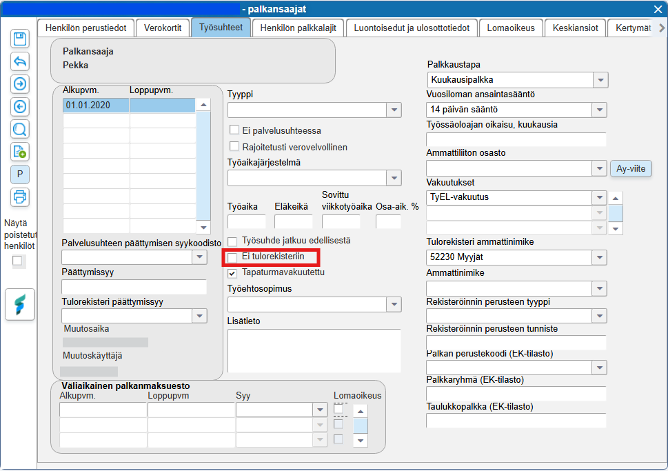 Katso myös ohje Tulorekisteri - Keva+VaEL-määritykset: Palkansaajakohtaiset perustiedot.